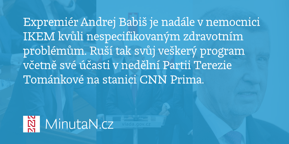 Andrej babiš je stále v nemocnici, zrušil veškerý svůj program i debatu s fialou. Předseda hnutí ano andrej babiš je nadále v nemocnici ikem kvůli nespecifikovaným zdravotním problémům, informovala dnes televize cnn prima . Předseda hnutí ano andrej babiš je nadále v nemocnici ikem kvůli nespecifikovaným zdravotním problémům, informovala v sobotu televize cnn prima news.… Expremiér andrej babiš musel v pátek kvůli zdravotním problémům do nemocnice. Předseda hnutí ano andrej babiš (čtk/petr kupec).